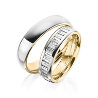 Paar Memoire-Trauringe/Eheringe von acredo in außen Platin 950/- , innen Gelbgold 750/- Oberfläche: poliert mit zus. 1,36 ct. Baguette-Diamant tw, vs (Produkt 1 mit Steinbesatz, Produkt 2 ohne Steinbesatz)