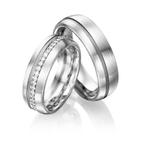Paar Memoire-Trauringe/Eheringe von Steinberg in Weißgold 585/- Graugold dunkel 585/- Oberfläche: längsmatt, poliert mit zus. 0,176 ct. Brillant tw, si (Produkt 1 mit Steinbesatz, Produkt 2 ohne Steinbesatz)