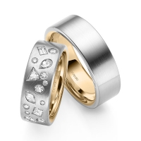 Paar Trauringe/Eheringe von acredo in außen Weißgold 585/- , innen Gelbgold 585/- Oberfläche: längsmatt, poliert mit zus. 0,9 ct. Prinzess-Diamant & Baguette-Diamant & Brillant tw, si tw, vs (Produkt 1 mit Steinbesatz, Produkt 2 ohne Steinbesatz)