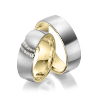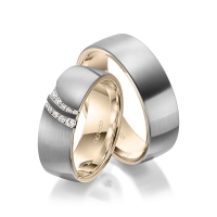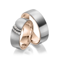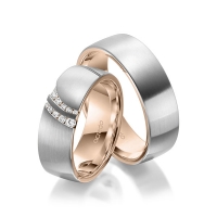Paar Trauringe/Eheringe von acredo in außen Weißgold 585/- , innen Rotgold 585/- Oberfläche: längsmatt, poliert mit zus. 0,116 ct. Brillant tw, si (Produkt 1 mit Steinbesatz, Produkt 2 ohne Steinbesatz)
