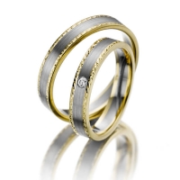 Paar Trauringe/Eheringe in Gelbgold 375/- Weißgold 375/- Oberfläche: gehämmert matt, längsmatt mit zus. 0,02 ct. Brillant tw, si (Produkt 1 mit Steinbesatz, Produkt 2 ohne Steinbesatz)