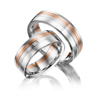 Paar Trauringe/Eheringe von acredo in Weißgold 585/- Rotgold 585/- Oberfläche: poliert, längsmatt mit zus. 0,03 ct. Prinzess-Diamant tw, si (Produkt 1 mit Steinbesatz, Produkt 2 ohne Steinbesatz)