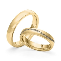 Paar Memoire-Trauringe/Eheringe von Merii in Gelbgold 585/- Oberfläche: längsmatt mit zus. 0,275 ct. Brillant tw, si (Produkt 1 mit Steinbesatz, Produkt 2 ohne Steinbesatz)