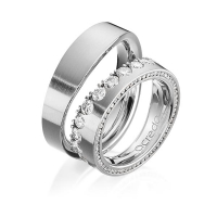 Paar Memoire-Trauringe/Eheringe von acredo in Graugold 585/- Oberfläche: längsmatt mit zus. 1,385 ct. Brillant tw, si (Produkt 1 mit Steinbesatz, Produkt 2 ohne Steinbesatz)
