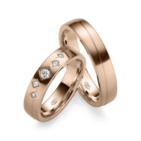 Paar Trauringe/Eheringe in Roségold 585/- Oberfläche: längsmatt mit zus. 0,116 ct. Brillant w, si (Produkt 1 mit Steinbesatz, Produkt 2 ohne Steinbesatz)