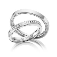 Paar Trauringe/Eheringe von acredo in Weißgold 585/- Oberfläche: längsmatt mit zus. 0,72 ct. Brillant & Prinzess-Diamant tw, si (Produkt 1 mit Steinbesatz, Produkt 2 ohne Steinbesatz)